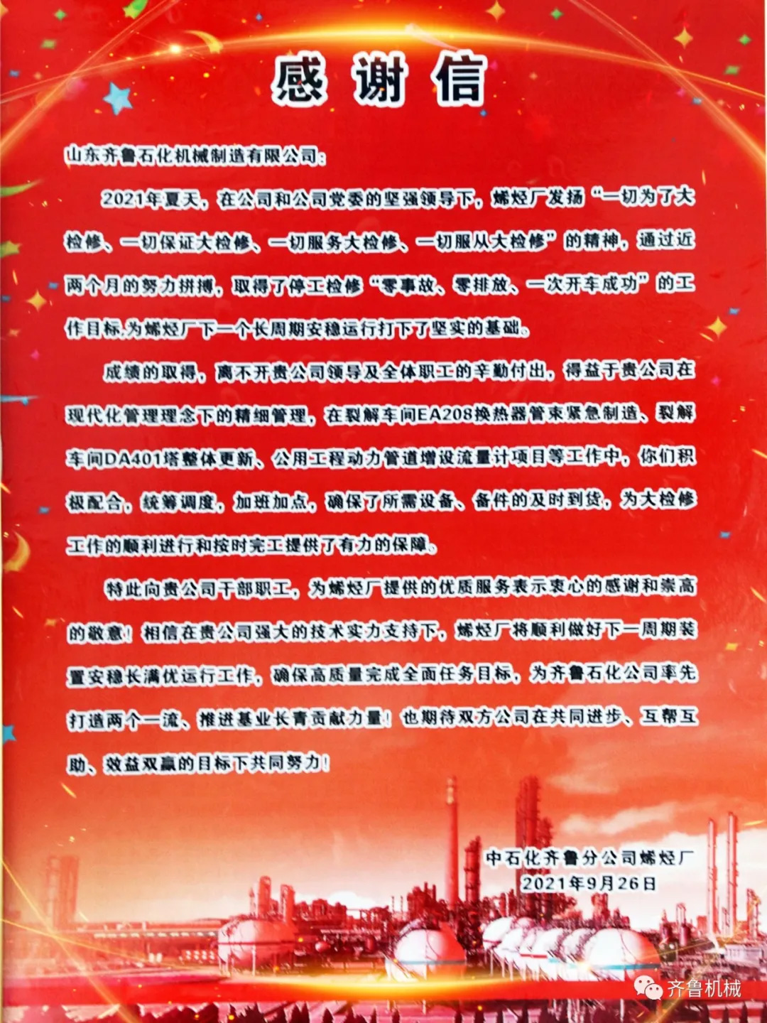 2021年9月30日中國(guó)石化齊魯分公司烯烴廠(chǎng)設(shè)備科副科長(zhǎng)丁文岳、設(shè)備科許潔為公司送來(lái)感謝信,感謝機(jī)械公司全體員工在檢修期間響應(yīng)號(hào)召,積極配合,加班加點(diǎn),攻堅(jiān)克難,全力保障檢修,確保維修設(shè)備及更新設(shè)備及時(shí)準(zhǔn)確的供應(yīng)。